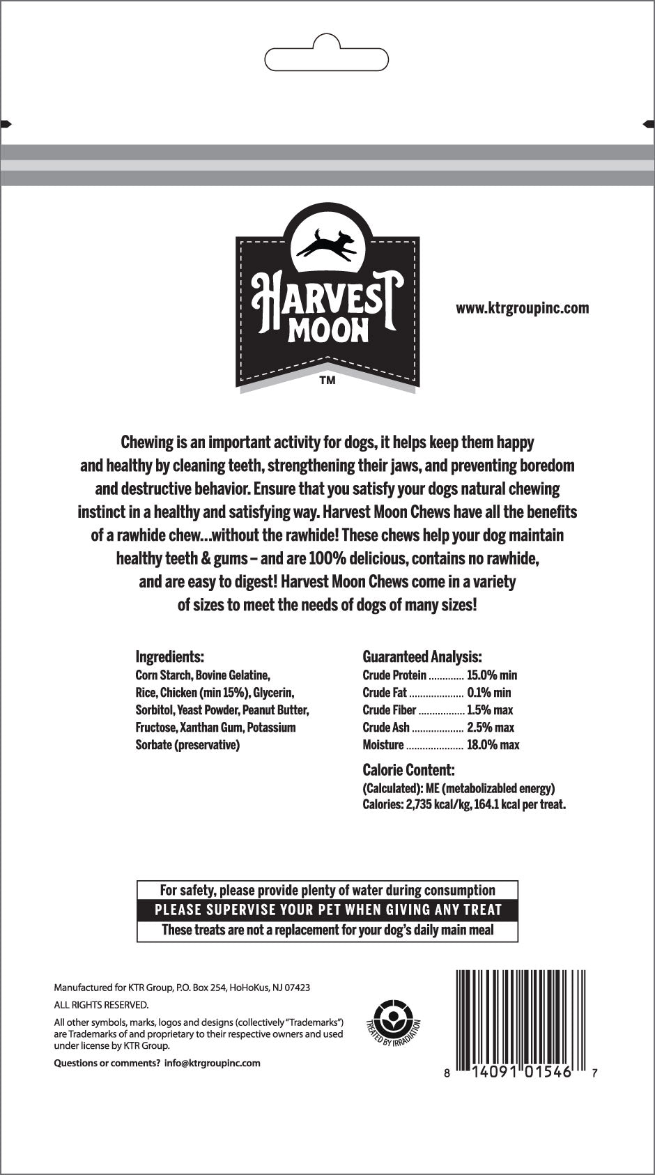 Harvest Moon Chews have all the benefits of a rawhide chew... without the rawhide! These chews help your dog maintain healthy teeth and gums - and are 100% delicious, contain no rawhide, and are easy to digest! Harvest Moon Chews come in a variety of sizes to meet the needs of dogs of many sizes!
