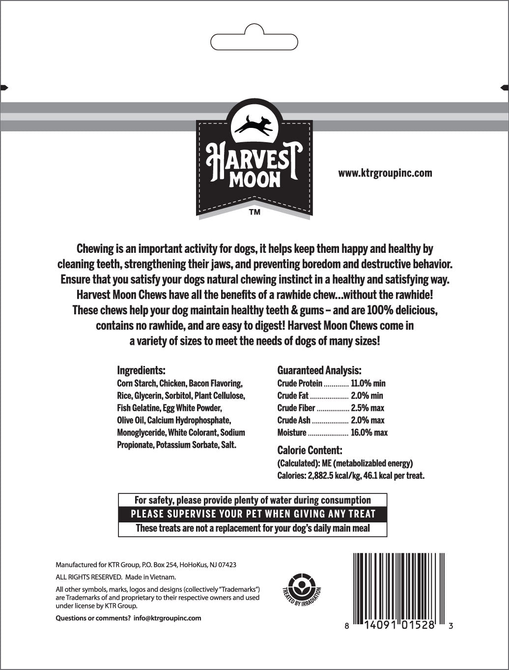Harvest Moon Chews have all the benefits of a rawhide chew... without the rawhide! These chews help your dog maintain healthy teeth and gums - and are 100% delicious, contain no rawhide, and are easy to digest! Harvest Moon Chews come in a variety of sizes to meet the needs of dogs of many sizes!