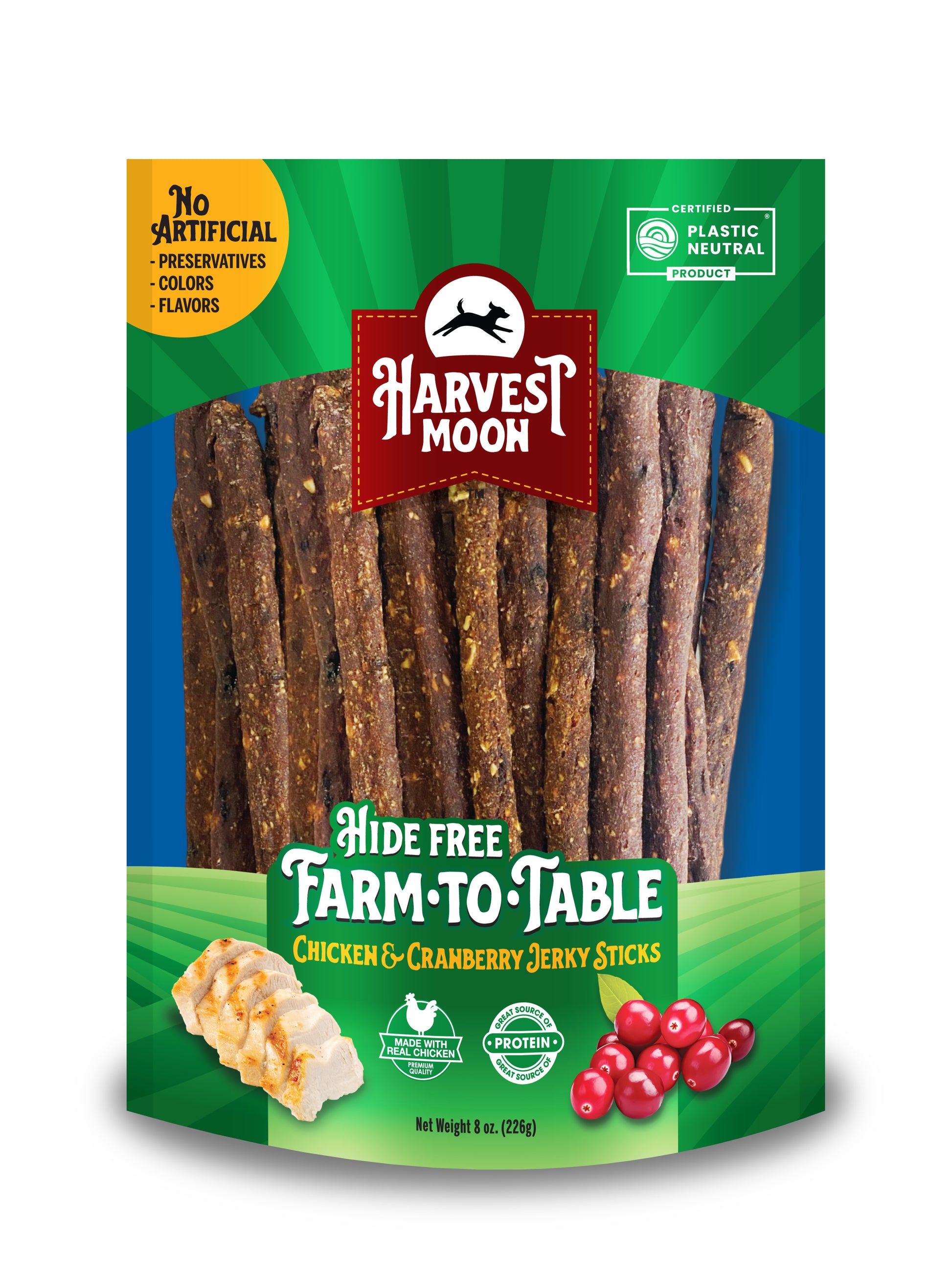 Harvest Moon Farm-to-Table Chicken & Cranberry Jerky Strips are handcrafted from 100% premium Chicken and Cranberries to provide a perfect balance of nutrition and flavor for dogs of every size and age.