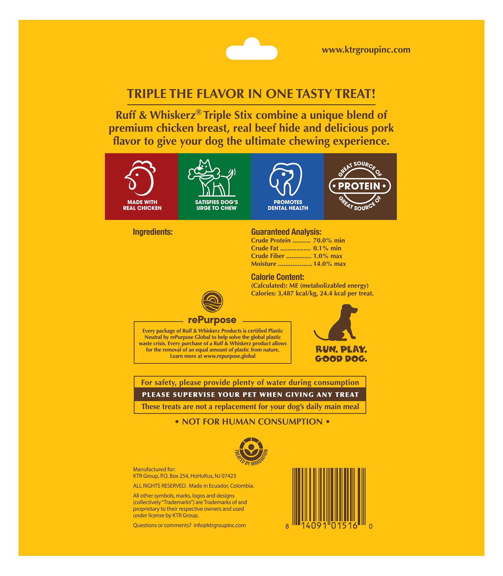 Ruff & Whiskerz Triple Stix wraps premium chicken breast around real beef-hide to give your pup a long-lasting treat sure to satisfy their chewing instinct!