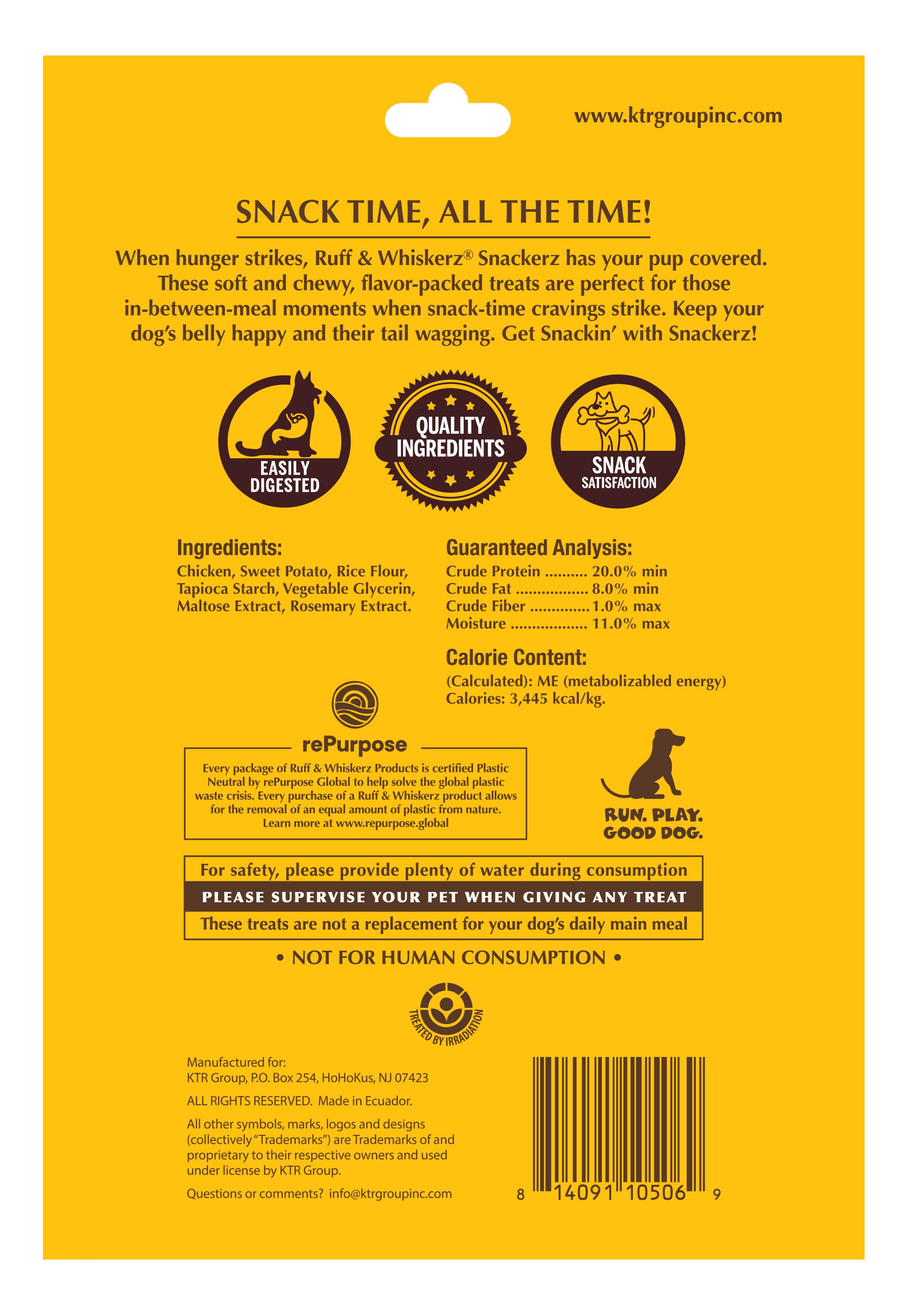 When hunger strikes, Ruff & Whiskerz Snackerz has your pup covered. These soft and chewy, flavor packed treats are perfect for those in-between-meal moments when snack-time cravings strike, Keep your dogs belly happy and their tail wagging. Get Snackin' with Snackerz!