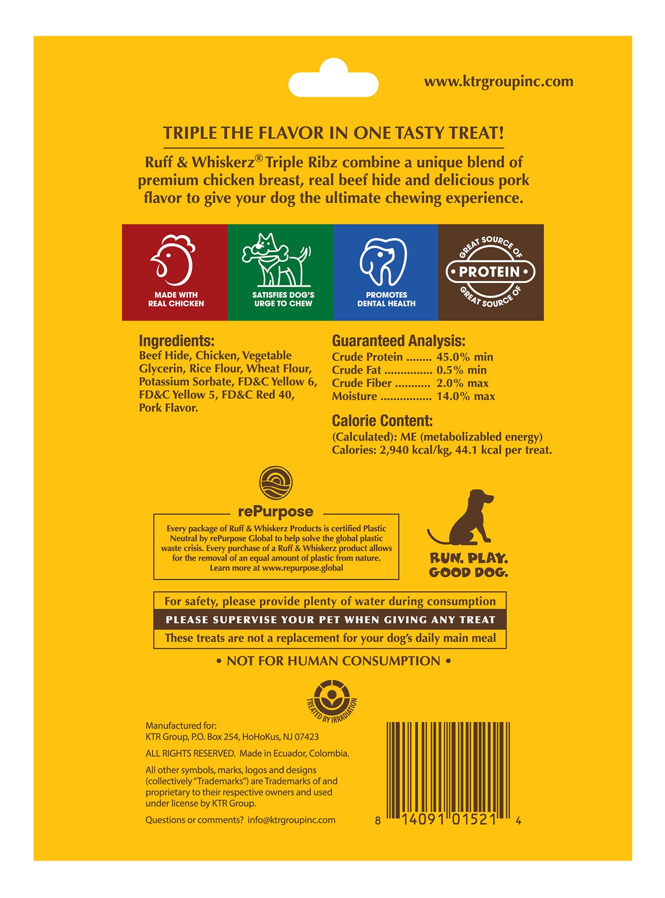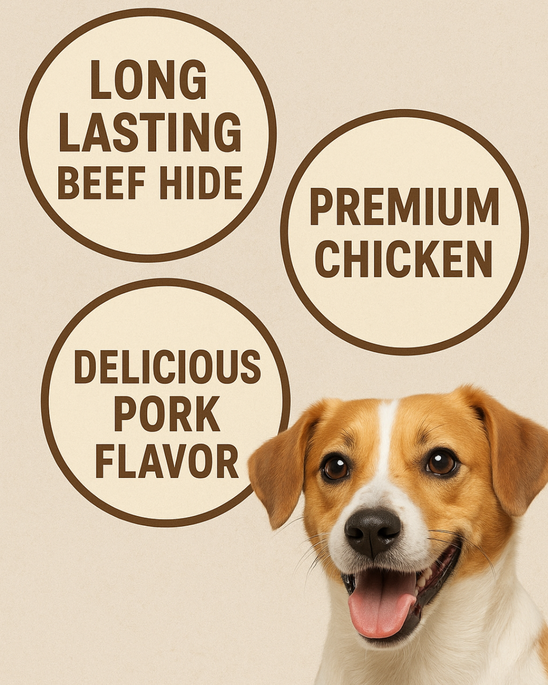 Ruff & Whiskerz Triple Ribz will satisfy your dogs craving to chew. Premium chicken breast with real beef hide is combined to create a unique treat that will keep your pup's tail waggin'