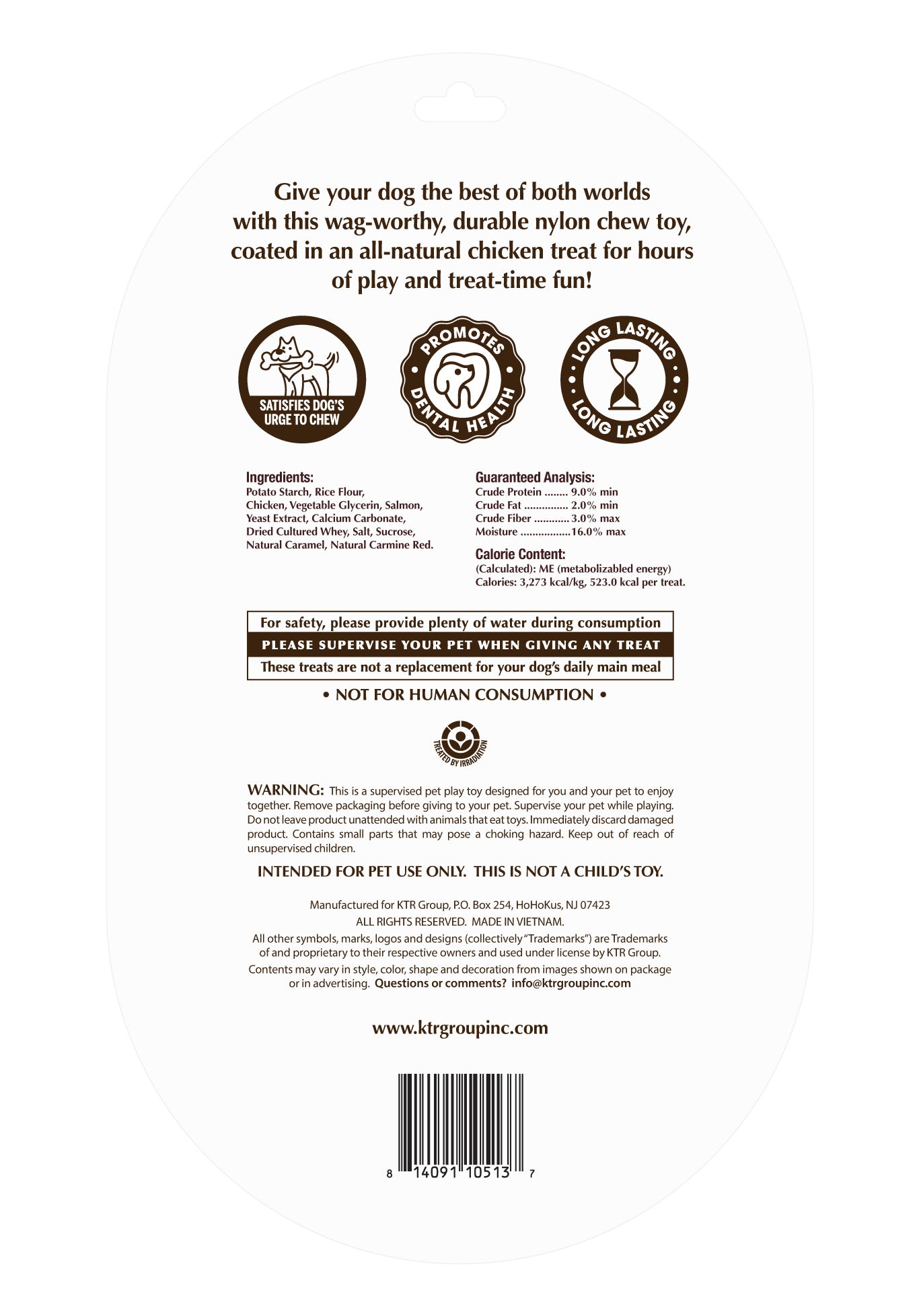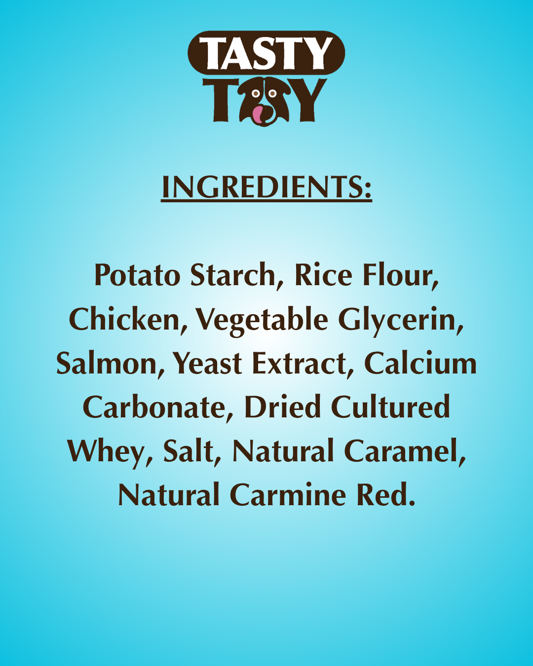 Give your dog the best of both worlds with this wag-worthy, durable, nylon chew toy, coated in an all natural chicken treat for hours of play and treat time fun!